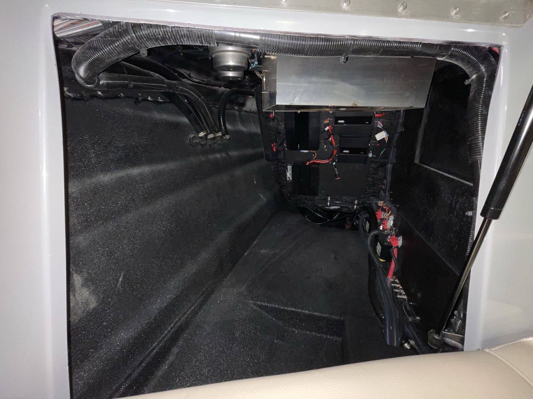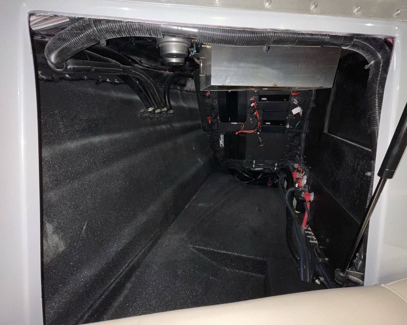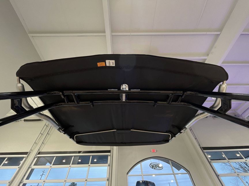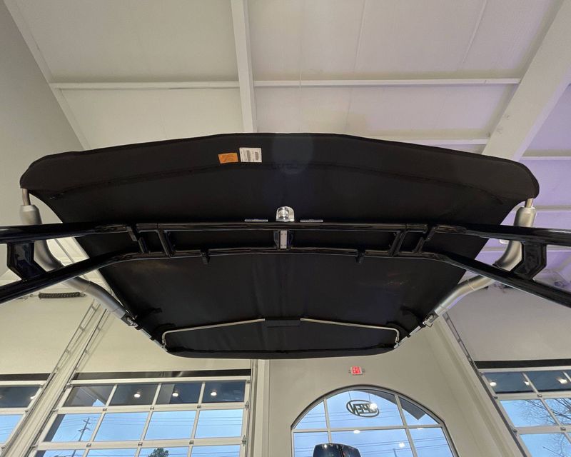 Designed with a Black Bimini Top for F-Series Tower by Roswell including surfboard storage sleeves, it also features a durable GRAY Boat Cover by Great Lakes outfitted with HANG TYTE.