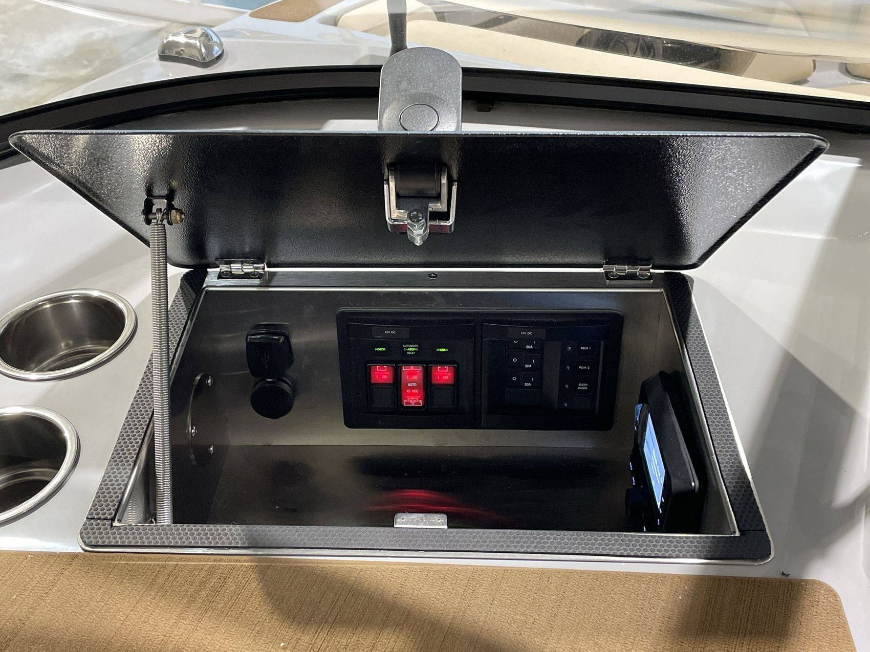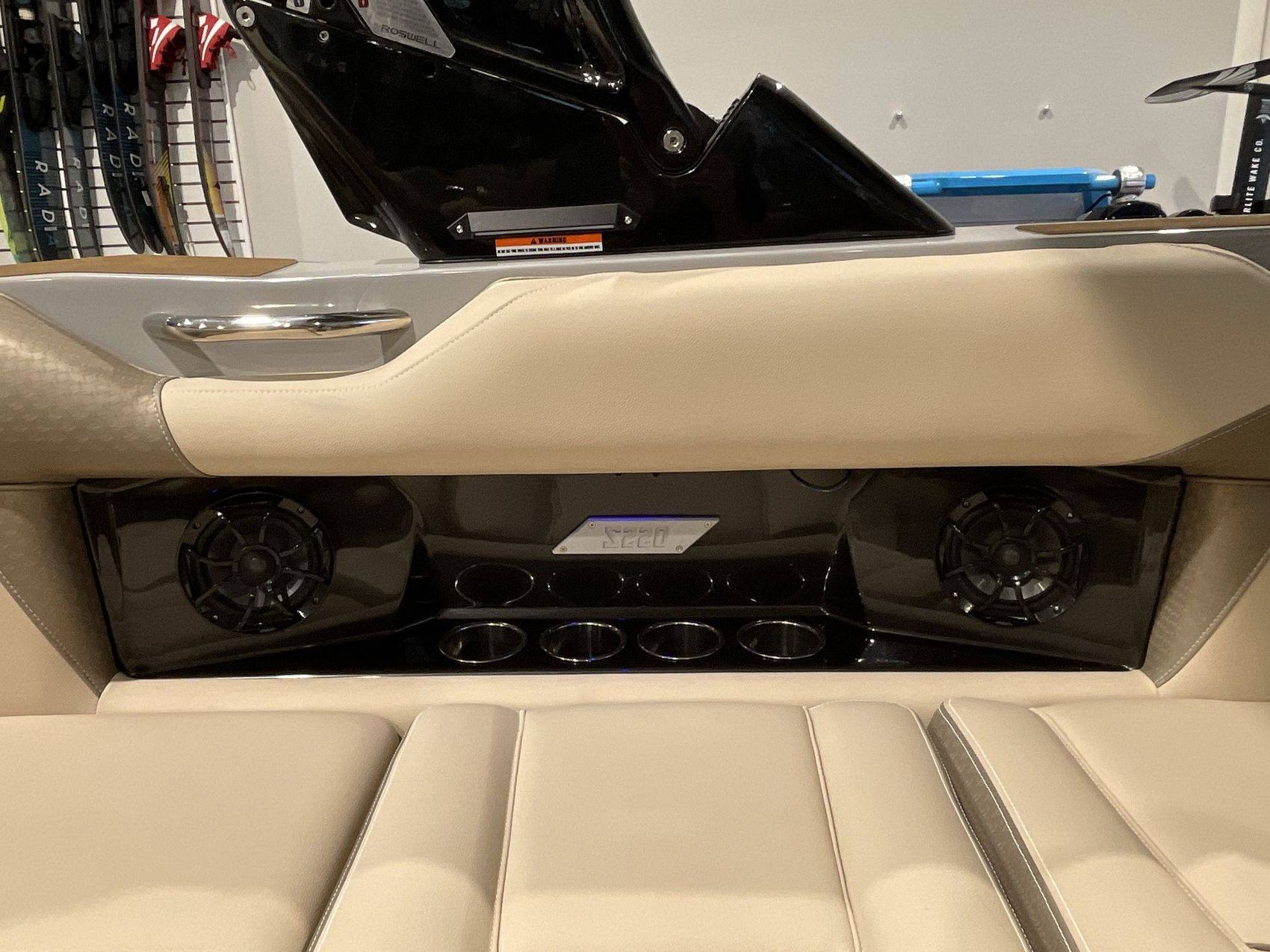 The S220’s exterior features a Hull Main Front Colour of Canadian Blue Metal Flake MF supplemented with a Stone Gray Hull Base. Along with the stylish 'Accent Outside The Box (OTB)’ texture available in multiple hues, the S220's upholstery emanates luxury.