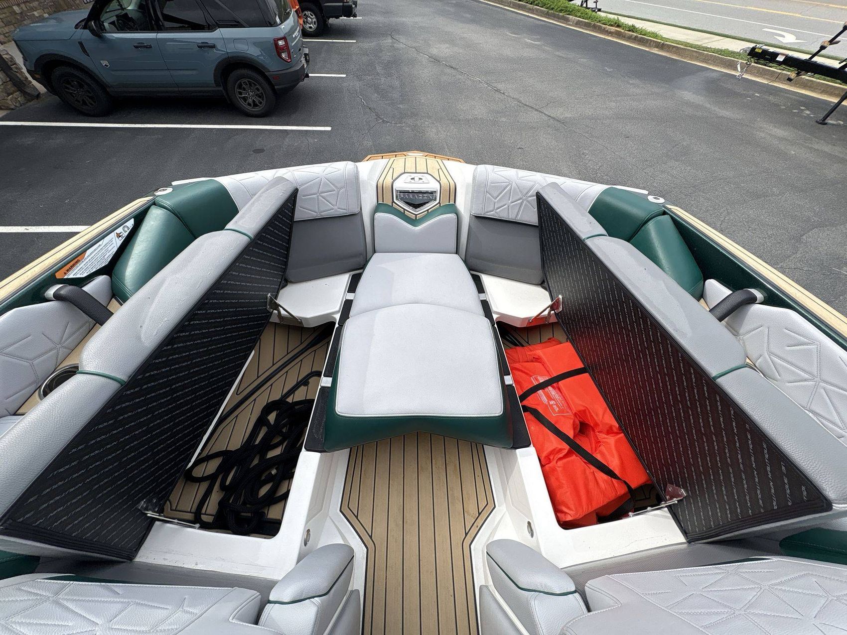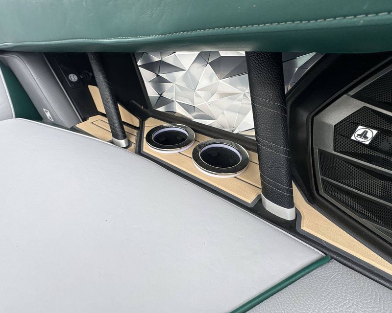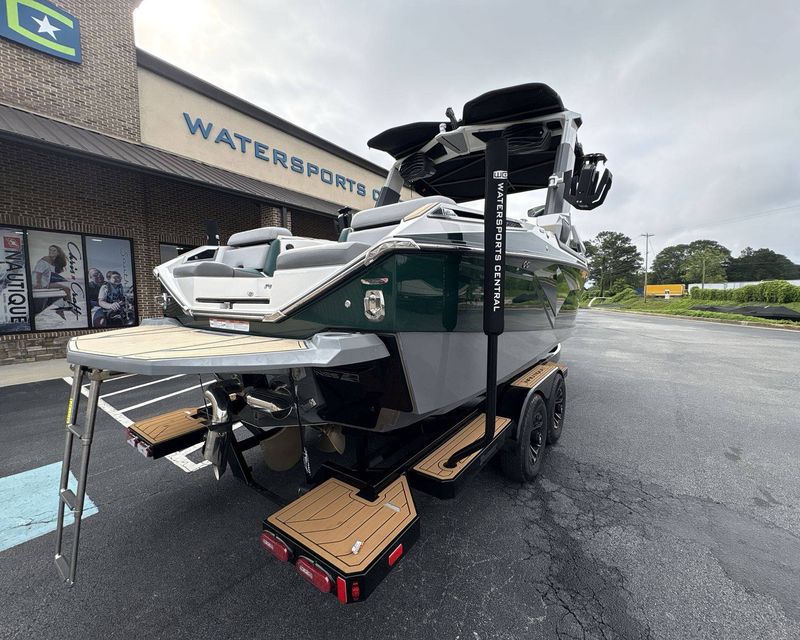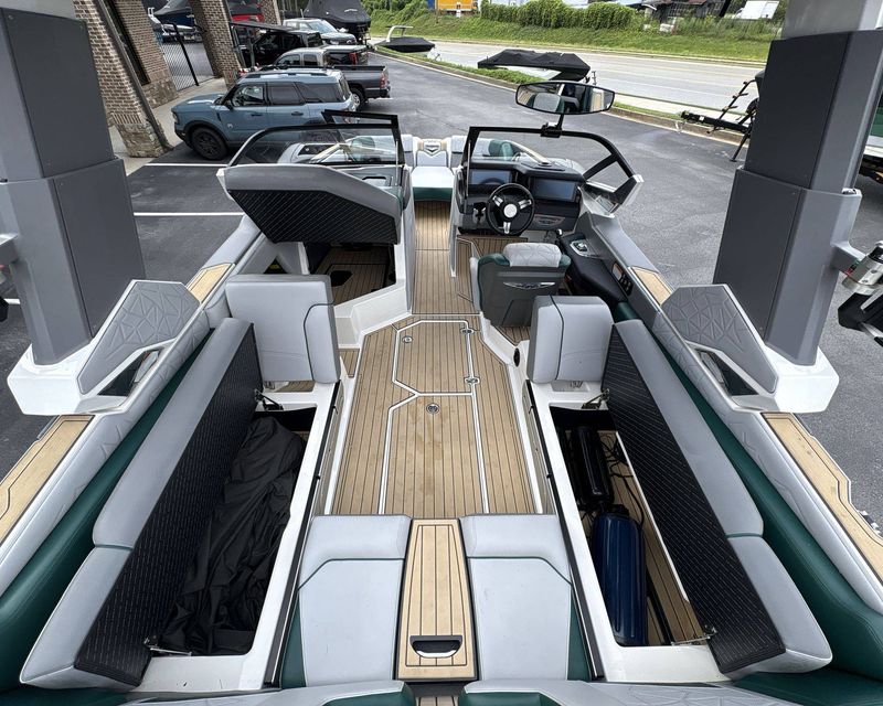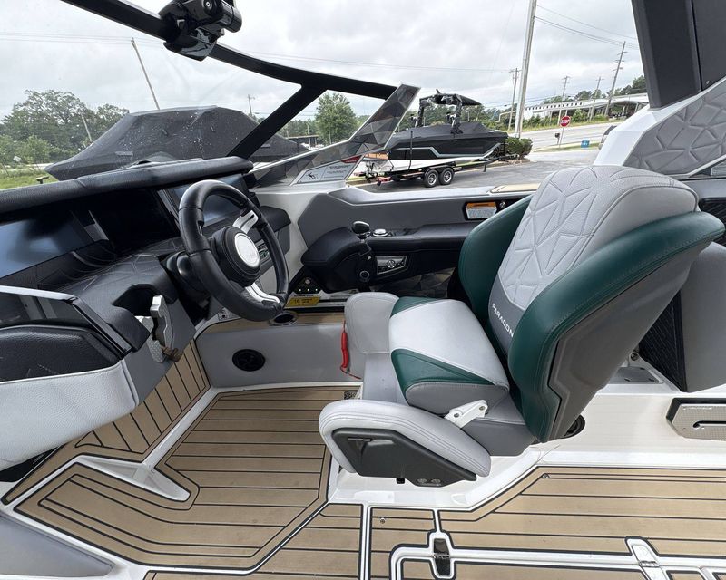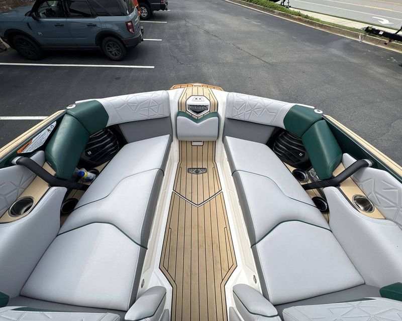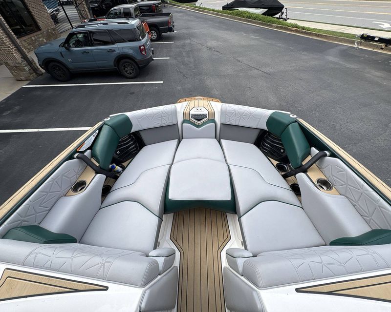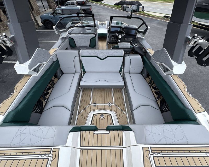 Incorporating a range of colors including Mystic White Interior Deck, Emerald Green Metal Flake Main Stripe, and Hull Rear, Tungsten Grey Hull Bottom, Mystic White FCT, Tungsten Grey FCT Secondary, Tungsten Grey Platform, Haze Grey Interior, Emerald Green Int Main Stripe and Int Accent Piping, Tungsten Grey Seat Boxing and Int Texture, Sahara Sand Non-Skid, and Tungsten Grey Thread Color, this boat truly stands out in aesthetics.