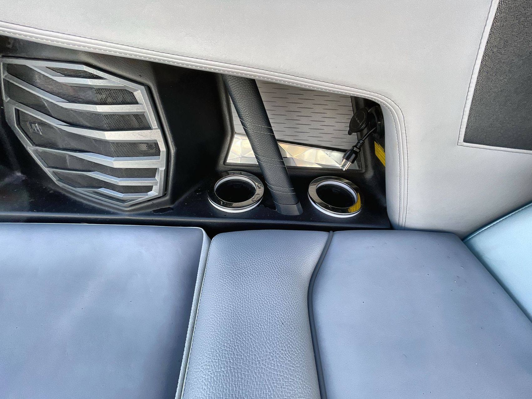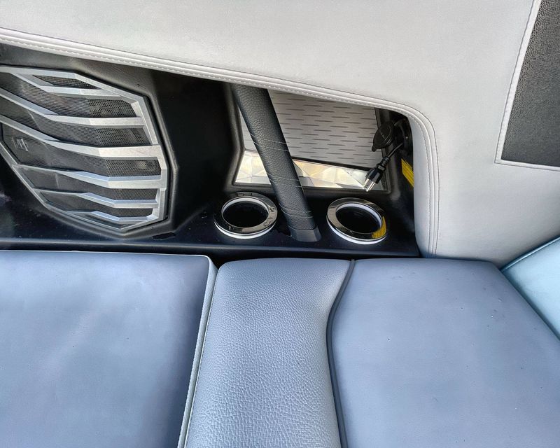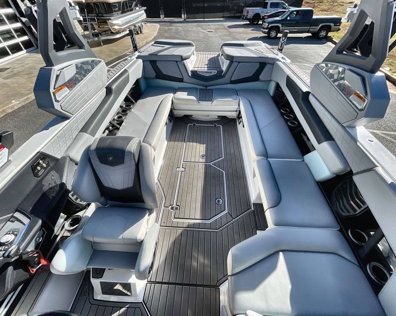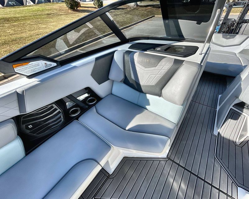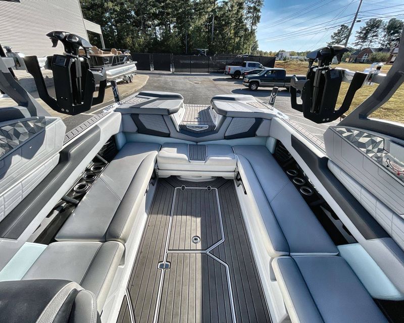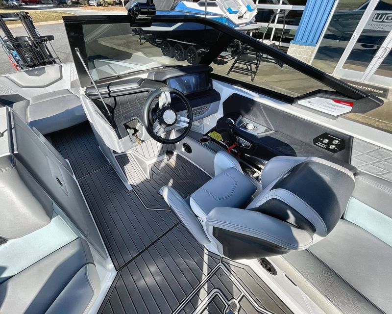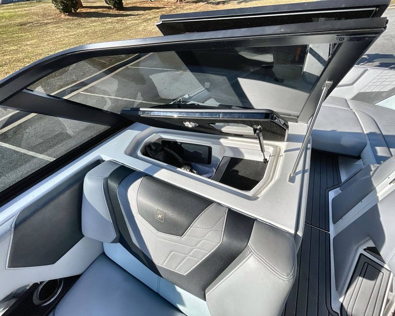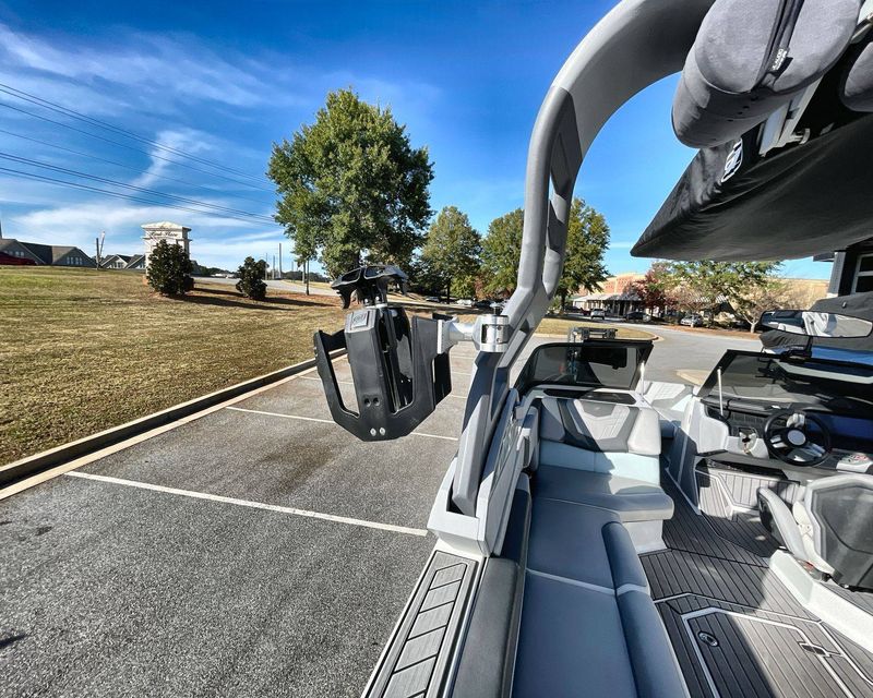 This boat's Flight Control Tower comes with a Nautique Awareness Camera, adding a layer of safety. Additionally, it also includes the Nautique Strapless Board Racks and a Tower Prep Kit from JL Audio M Series Studio, enhancing your entertainment onboard.