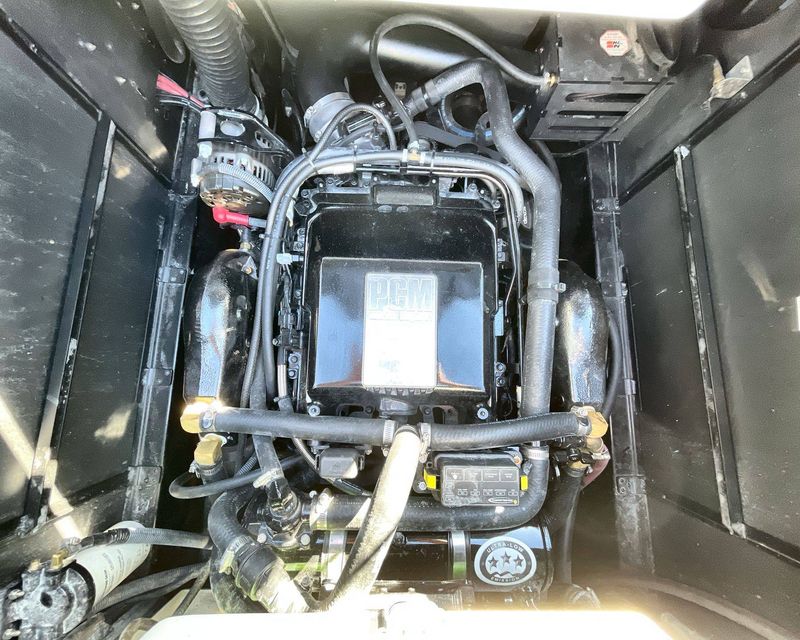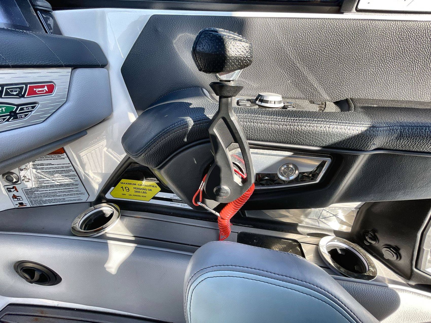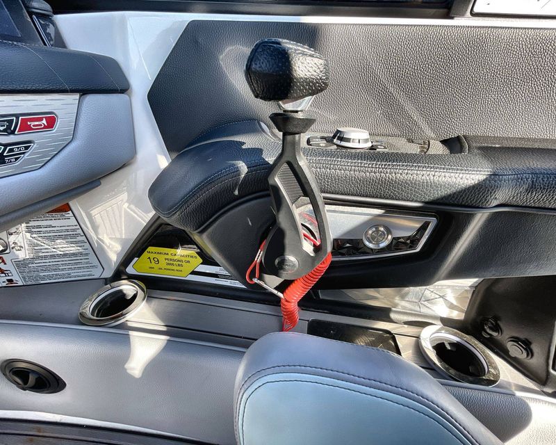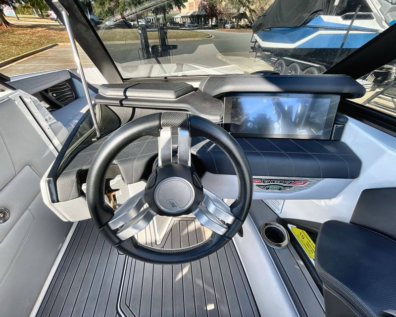 Navigate with ease with the Tandem Spoke Leather Steering Wheel, offering comfortable driving. Plus, the boat is outfitted with a convenient Walk-Thru Air-Dam (Pocket Door), ensuring an ultimately comfortable boating day.