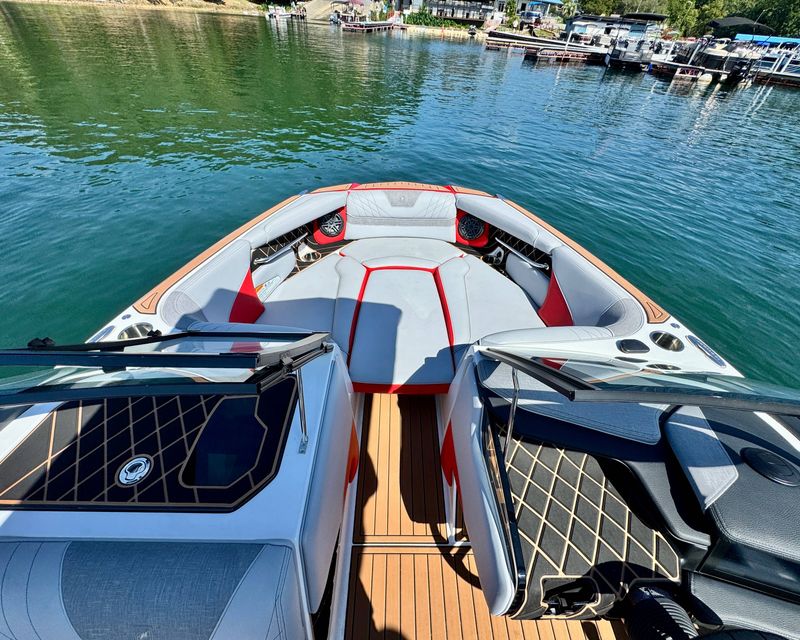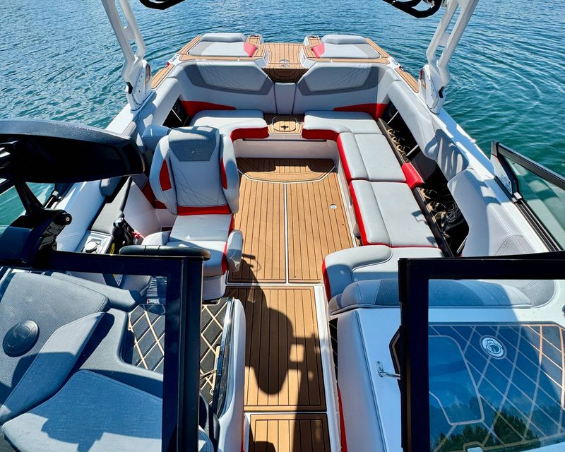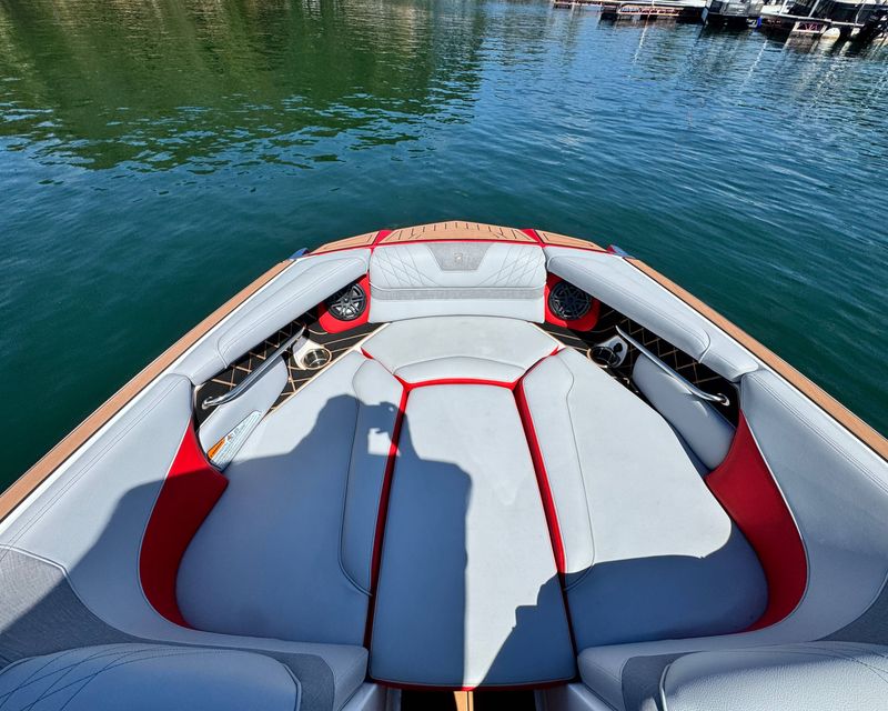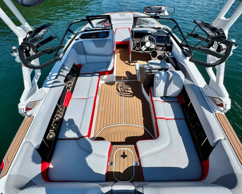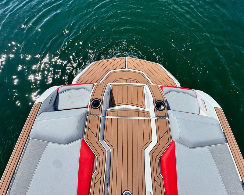 Color Details: The boat showcases a contemporary design with a strikingly pristine white hull. Accentuating this, there are tastefully designed red accents distributed throughout the craft's body, adding an undeniably bold and pleasing contrast.