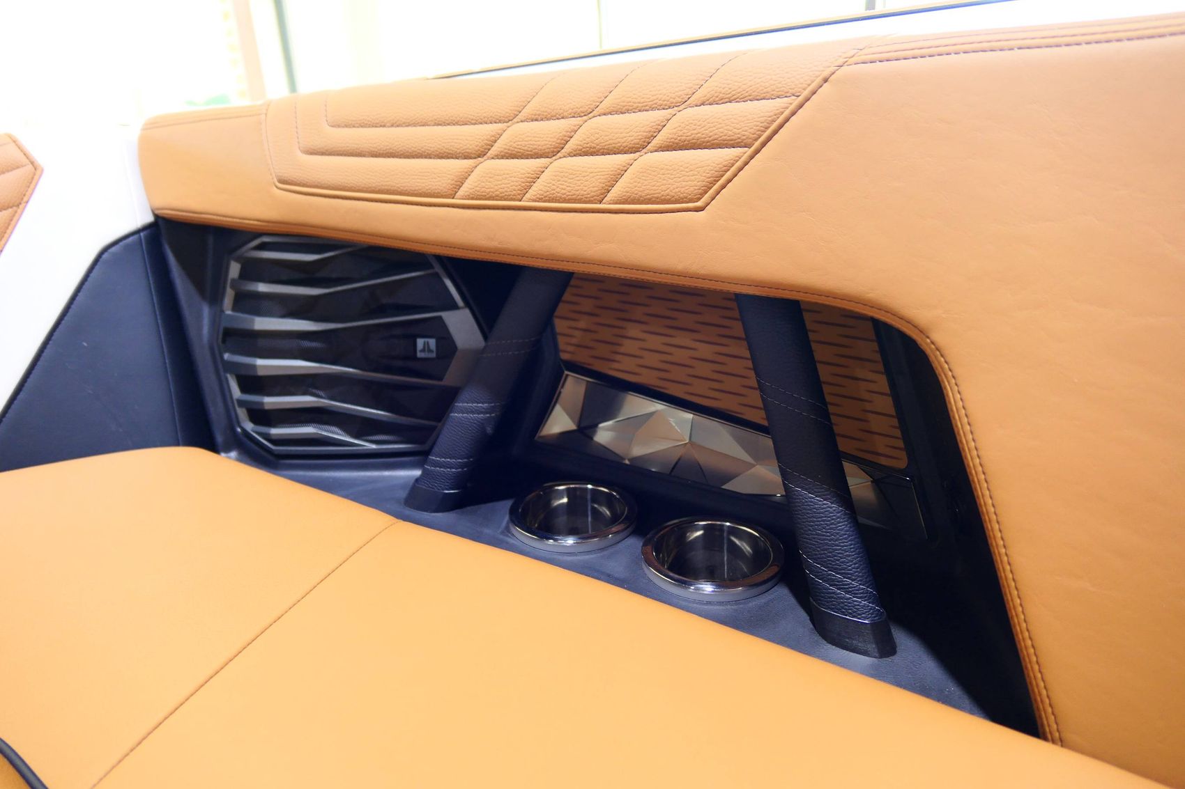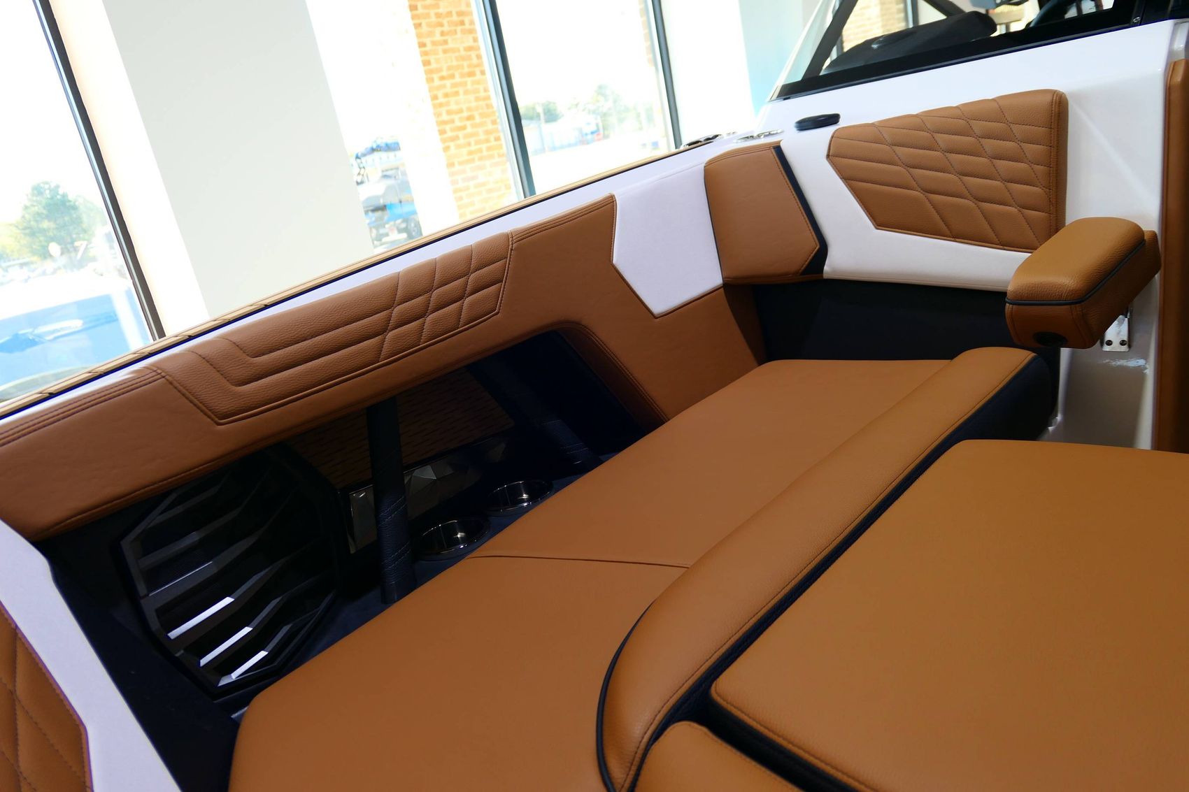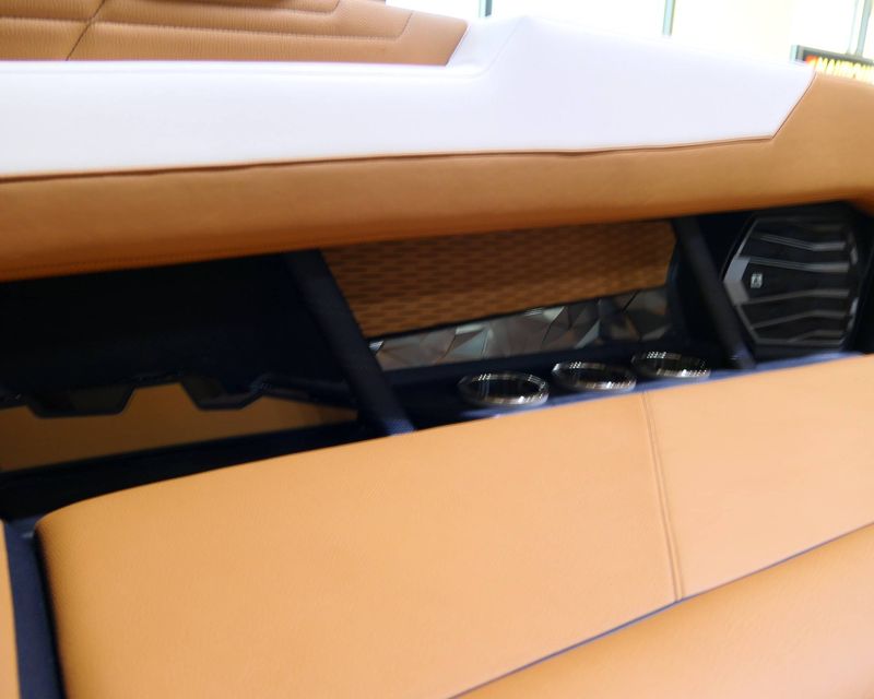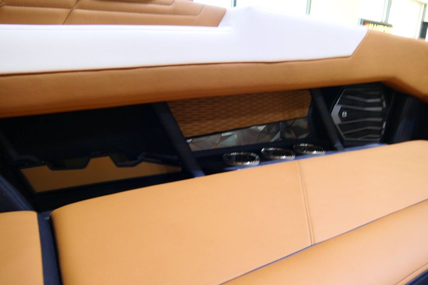 The boat also offers an exceptional sound system - JL Audio M6 Series Studio Elite (Wavefront) with a Stereo - Transom Mounted Remote Control. Walk-Thru Air-Dam