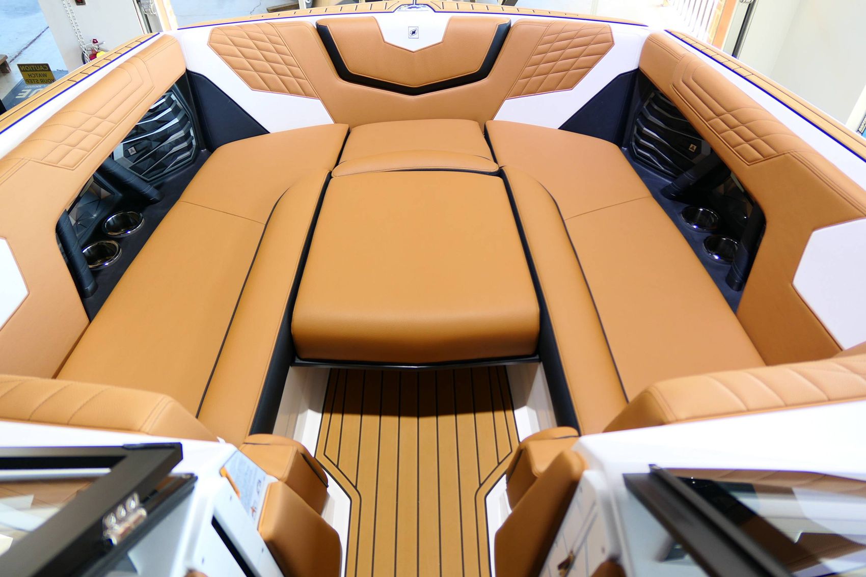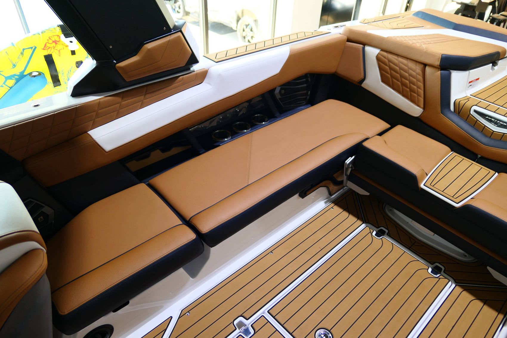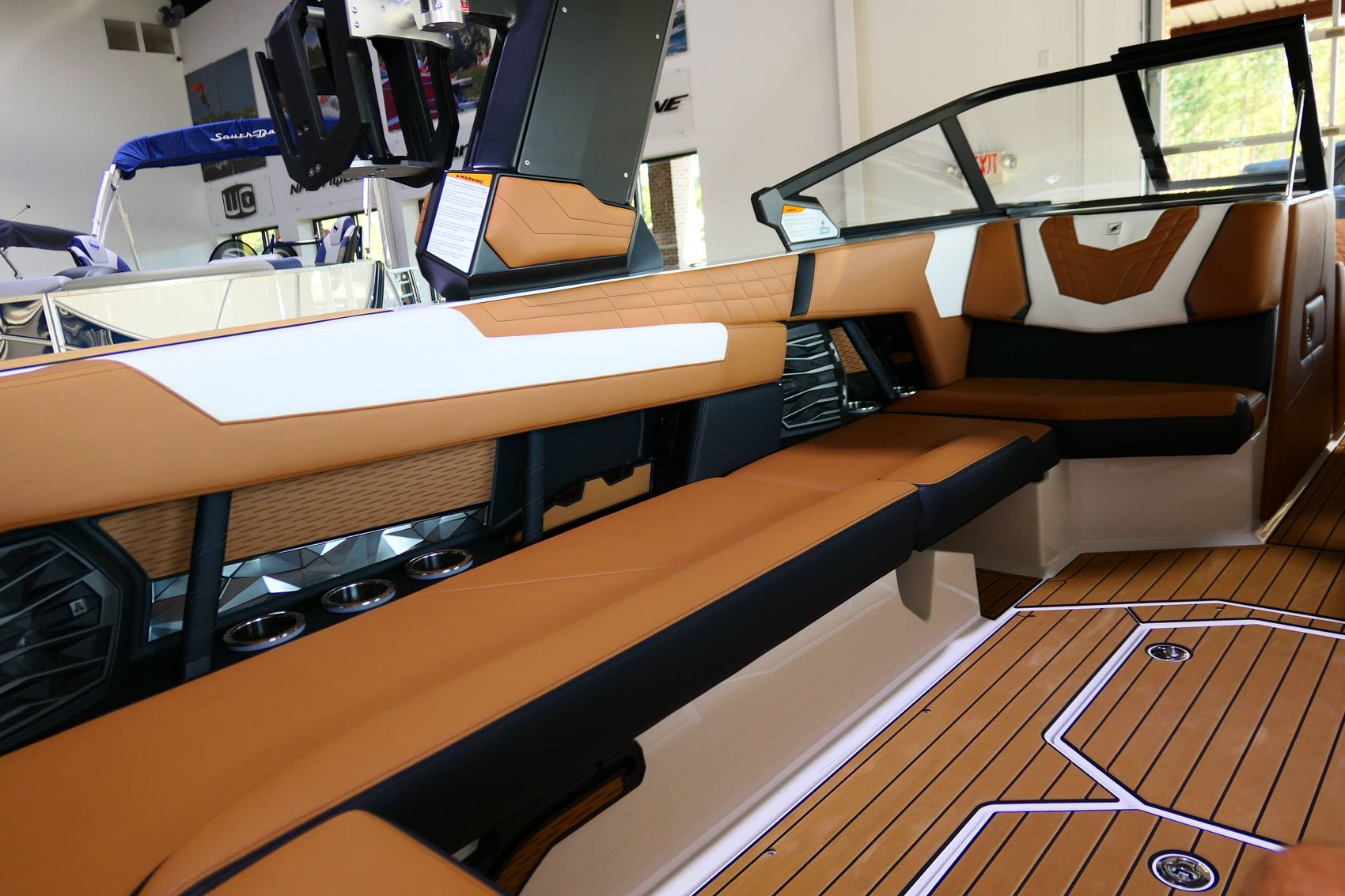 The boat also offers an exceptional sound system - JL Audio M6 Series Studio Elite (Wavefront) with a Stereo - Transom Mounted Remote Control. Walk-Thru Air-Dam