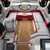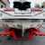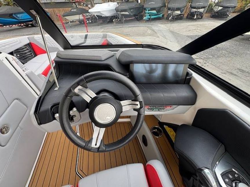 The boat showcases a Walk-Thru Air-Dam (Pocket Door), along with a striking color scheme of Bright Chrome Finish with Illusion Frost Chromax for appealing aesthetics. The interior deck comes in Mystic White, whereas, the main stripe, accent, hull bottom, platform color, and seat boxing color are all in Victory Red. The Flight Control Tower (FCT) and its secondary color are in an attractive Jet Black, along with the interior chromax which has a Bright Chrome finish with Illusion Frost. The primary interior is in Haze Grey> with the featured texture color being a smooth Tungston Grey Truewave. The accent piping color is a sharp Jet Black Truewave and the thread color is a standard Black. Lastly, the non-skid color is a Mocha Brown.