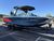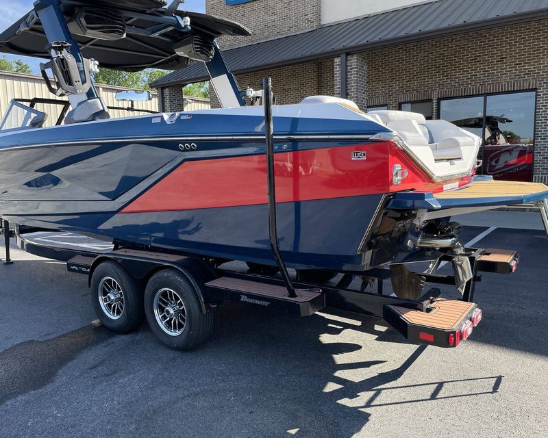 Interiors have been tastefully designed with MYSTIC WHITE Interior Deck, ADMIRAL BLUE METAL FLAKE Main Stripe, VICTORY RED Accent, and ADMIRAL BLUE Hull Bottom. The Flight Control Tower is ADMIRAL BLUE with MYSTIC WHITE as the secondary color. The boat's platform color is ADMIRAL BLUE, providing a uniform and cohesive look.